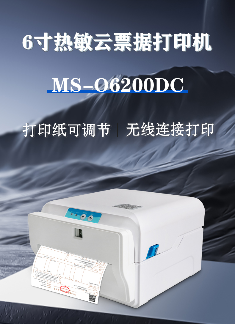 美松自助發(fā)票云打印機MS-O6200DC是一款6寸熱敏條碼打印機,有效打印寬度可達144mm,可容納最大160mm寬的紙卷,擁有USB,網(wǎng)口,串口,WIFI接口.采用熱敏打印,且發(fā)票信息保存時間較長,解決普通熱敏紙易消失的痛點.
